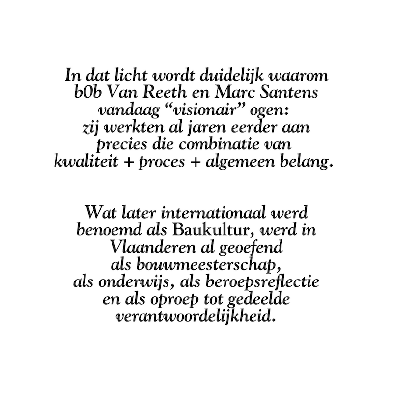 In dat licht wordt duidelijk waarom b0b Van Reeth en Marc Santens vandaag “visionair” ogen: zij werkten al jaren eerder aan precies die combinatie van kwaliteit + proces + algemeen belang. Wat later internationaal werd benoemd als Baukultur, werd in Vlaanderen al geoefend als bouwmeesterschap, als onderwijs, als beroepsreflectie en als oproep tot gedeelde verantwoordelijkheid.